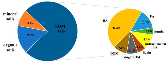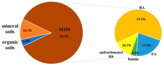 Using NMR spectroscopy, the processes of transformation and establishment of the SOM system over time under the action of various factors (agricultural use, burying, primary succession, fires, etc.) on soils were studied. The articles analyzed cover a wide range of different SOM pools, from high-molecular-weight biopolymers (HS fractions, lignin, dissolved organic matter (DOM)) to single organic substances (polycyclic aromatic hydrocarbons, pesticides, antibiotics, etc.). Most articles (67.9%) are devoted to the study of the molecular composition of HS fractions—HA, FA, humin or unfractionated HSs (Figure 6). Much less frequently, native mineral and/or organic (peat) soil horizons were studied by NMR (35.8%).