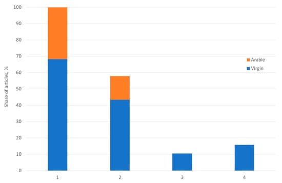 Distribution of articles using different parameters of EPR spectra in their analyses in the study of virgin and arable SOM: FR concentration (1), g-factor value (2), spectral shape (3) and peak-to-peak line width (4).