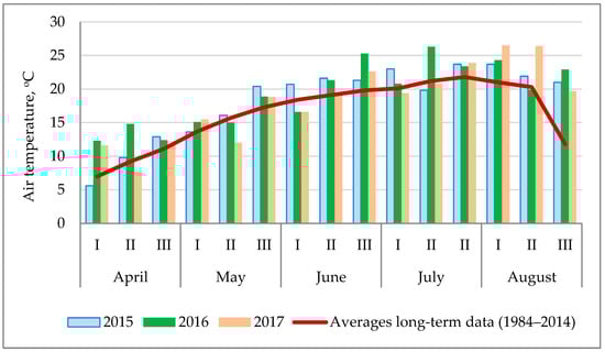 Average air temperature per decade (I, II, III) during the growing seasons of 2015–2017, according to the meteorological post of the Poltava State Agricultural Experimental Station of the Institute of Swine Production and Agro-Industrial Production in Ukraine.