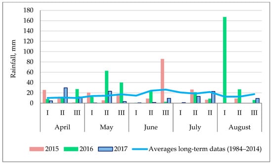 Sum of rainfall per decade (I, II, III) during the growing seasons of 2015–2017, according to the meteorological post of the Poltava State Agricultural Experimental Station of the Institute of Swine Production and Agro-Industrial Production in Ukraine.