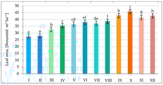 Leaf area of peas in various combinations of mineral fertilization and seed inoculation with the microbial preparation Rhizogumin. I—control object (R0 + N0P0K0); II—R1 + N0P0K0; III—R0 + N15P15K15; IV—R1 + N15P15K15; V—R0 + N15P30K30 + N15; VI—R1 + N15P30K30 + N15; VII—R0 + N30P30K30; VIII—R1 + N30P30K30; IX—R0 + N30P45K45 + N15; X—R1 + N30P45K45 + N15; XI—R0 + N45P45K45; XII—R1 + N45P45K45; R1—with seed inoculation, R0—without seed inoculation. The differences between data indicated by the same letter are not statistically significant (p ≤ 0.05); ±SE.