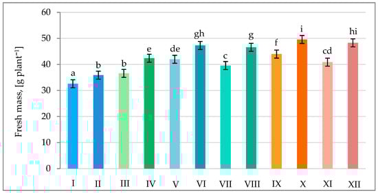 Fresh mass of pea plants in various combinations of mineral fertilization and seed inoculation with the microbial preparation Rhizogumin. I—control object (R0 + N0P0K0); II—R1 + N0P0K0; III—R0 + N15P15K15; IV—R1 + N15P15K15; V—R0 + N15P30K30 + N15; VI—R1 + N15P30K30 + N15; VII—R0 + N30P30K30; VIII—R1 + N30P30K30; IX—R0 + N30P45K45 + N15; X—R1 + N30P45K45 + N15; XI—R0 + N45P45K45; XII—R1 + N45P45K45; R1—with seed inoculation, R0—without seed inoculation. The differences between data indicated by the same letter are not statistically significant (p ≤ 0.05); ±SE.