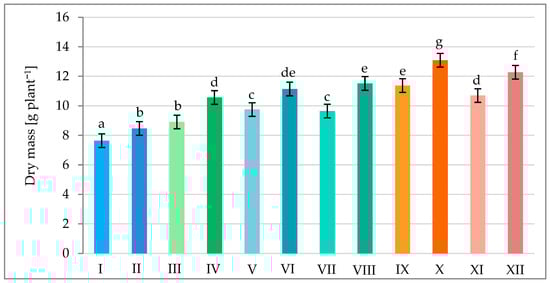 Dry mass of aboveground parts of pea plants in various combinations of mineral fertilization and seed inoculation with the microbial preparation Rhizogumin. I—control object (R0 + N0P0K0); II—R1 + N0P0K0; III—R0 + N15P15K15; IV—R1 + N15P15K15; V—R0 + N15P30K30 + N15; VI—R1 + N15P30K30 + N15; VII—R0 + N30P30K30; VIII—R1 + N30P30K30; IX—R0 + N30P45K45 + N15; X—R1 + N30P45K45 + N15; XI—R0 + N45P45K45; XII—R1 + N45P45K45; R1—with seed inoculation, R0—without seed inoculation. The differences between data indicated by the same letter are not statistically significant (p ≤ 0.05); ±SE.