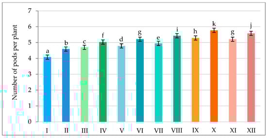 Number of pods per plant of pea in various combinations of mineral fertilization and seed inoculation with the microbial preparation Rhizogumin. I—control object (R0 + N0P0K0); II—R1 + N0P0K0; III—R0 + N15P15K15; IV—R1 + N15P15K15; V—R0 + N15P30K30 + N15; VI—R1 + N15P30K30 + N15; VII—R0 + N30P30K30; VIII—R1 + N30P30K30; IX—R0 + N30P45K45 + N15; X—R1 + N30P45K45 + N15; XI—R0 + N45P45K45; XII—R1 + N45P45K45; R1—with seed inoculation, R0—without seed inoculation. The differences between data indicated by the same letter are not statistically significant (p ≤ 0.05); ±SE.