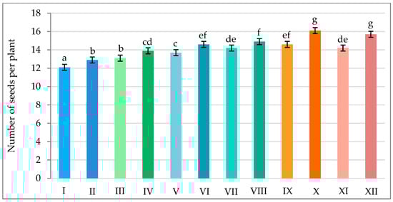Number of seeds per plant of pea in various combinations of mineral fertilization and seed inoculation with the microbial preparation Rhizogumin. I—control object (R0 + N0P0K0); II—R1 + N0P0K0; III—R0 + N15P15K15; IV—R1 + N15P15K15; V—R0 + N15P30K30 + N15; VI—R1 + N15P30K30 + N15; VII—R0 + N30P30K30; VIII—R1 + N30P30K30; IX—R0 + N30P45K45 + N15; X—R1 + N30P45K45 + N15; XI—R0 + N45P45K45; XII—R1 + N45P45K45; R1—with seed inoculation, R0—without seed inoculation. The differences between data indicated by the same letter are not statistically significant (p ≤ 0.05); ±SE.