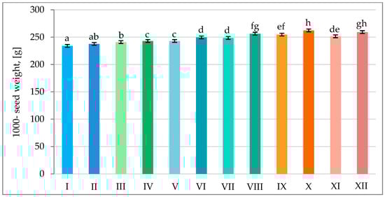 Thousand-seed weight of peas in various combinations of mineral fertilization and seed inoculation with the microbial preparation Rhizogumin. I—control object (R0 + N0P0K0); II—R1 + N0P0K0; III—R0 + N15P15K15; IV—R1 + N15P15K15; V—R0 + N15P30K30 + N15; VI—R1 + N15P30K30 + N15; VII—R0 + N30P30K30; VIII—R1 + N30P30K30; IX—R0 + N30P45K45 + N15; X—R1 + N30P45K45 + N15; XI—R0 + N45P45K45; XII—R1 + N45P45K45; R1—with seed inoculation, R0—without seed inoculation. The differences between data indicated by the same letter are not statistically significant (p ≤ 0.05); ±SE.