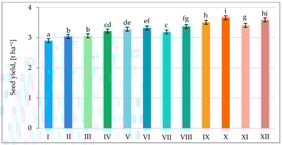 Seed yield of pea in various combinations of mineral fertilization and seed inoculation with the microbial preparation Rhizogumin (average for 2015–2017). I—control object (R0 + N0P0K0); II—R1 + N0P0K0; III—R0 + N15P15K15; IV—R1 + N15P15K15; V—R0 + N15P30K30 + N15; VI—R1 + N15P30K30 + N15; VII—R0 + N30P30K30; VIII—R1 + N30P30K30; IX—R0 + N30P45K45 + N15; X—R1 + N30P45K45 + N15; XI—R0 + N45P45K45; XII—R1 + N45P45K45; R1—with seed inoculation, R0—without seed inoculation. The differences between data indicated by the same letter are not statistically significant (p ≤ 0.05); ±SE.