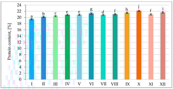 Average protein content in pea seeds in various combinations of mineral fertilization and seed inoculation with the microbial preparation Rhizogumin. I—control object (R0 + N0P0K0); II—R1 + N0P0K0; III—R0 + N15P15K15; IV—R1 + N15P15K15; V—R0 + N15P30K30 + N15; VI—R1 + N15P30K30 + N15; VII—R0 + N30P30K30; VIII—R1 + N30P30K30; IX—R0 + N30P45K45 + N15; X—R1 + N30P45K45 + N15; XI—R0 + N45P45K45; XII—R1 + N45P45K45; R1—with seed inoculation, R0—without seed inoculation. The differences between data indicated by the same letter are not statistically significant (p ≤ 0.05); ±SE.