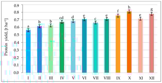Average protein yield of pea in various combinations of mineral fertilization and seed inoculation with the microbial preparation Rhizogumin. I—control object (R0 + N0P0K0); II—R1 + N0P0K0; III—R0 + N15P15K15; IV—R1 + N15P15K15; V—R0 + N15P30K30 + N15; VI—R1 + N15P30K30 + N15; VII—R0 + N30P30K30; VIII—R1 + N30P30K30; IX—R0 + N30P45K45 + N15; X—R1 + N30P45K45 + N15; XI—R0 + N45P45K45; XII—R1 + N45P45K45; R1—with seed inoculation, R0—without seed inoculation. The differences between data indicated by the same letter are not statistically significant (p ≤ 0.05); ±SE.