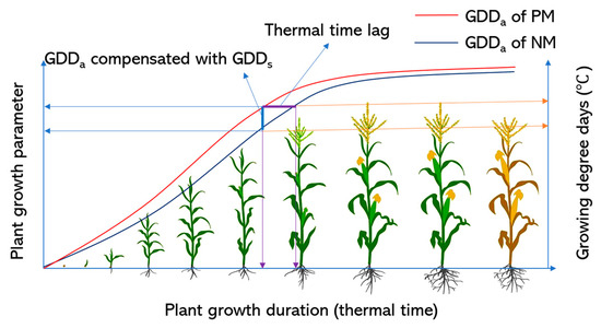 Studies have found that the increased soil temperature by PM has a good compensatory effect on the growing degree days based on the air temperature (GDDa), allowing crop growth and development to be regulated effectively [99,100]. That is, a thermal time lag of plant development occurs between NM and PM, and the increased soil temperature under PM compensates for the thermal time lag [43,69]. This phenomenon is known as the compensatory effect of PM [101], which can objectively reflect the influence of PM on crop growth and development (Figure 1).