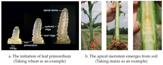 Initiation of leaf primordium and the emergency of apical meristem from soil, taking wheat (a) and maize (b) as example, respectively.