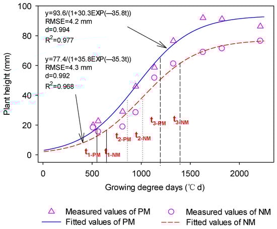 Ding et al. [43] showed that the logistic equation with thermal time sufficiently characterized the cumulative processes of plant height and aboveground biomass in a PM treatment (Figure 4). The logistic curve equation can better fit the cumulative process of different crop growth indicators, and the changes in the curve, such as the different positions of inflection points on the curve, can better characterize and quantify the process of crop growth and development. The logistic equation takes the second derivative of Y and sets the equation equal to zero. Then, the maximum relative growth rate (or maximum cumulative rate; vm) and the corresponding occurrence time (tm) can be solved on the S curve. The logistic equation takes the third-order derivative of Y and sets its equation equal to zero. Values of the two inflection points t1 and t2 on the S curve can be obtained. All of the above parameters are the eigenvalues on the S curve of the logistic equation. These eigenvalues are calculated as follows: