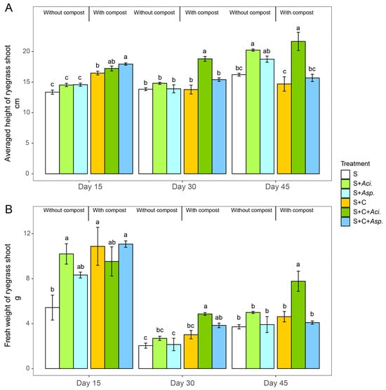 The average height (A) and fresh weight (B) of ryegrass shoots at three sampling time points (day 15, day 30, and day 45) across the six treatments. S: soil without fertilization, S + Aci.: soil inoculated with Acinetobacter sp., S + Asp.: soil inoculated with Aspergillus niger, S + C: soil mixed with straw compost, S + C + Aci.: soil mixed with straw compost and Acinetobacter sp., and S + C + Asp.: soil mixed with straw compost and Aspergillus niger. Data are shown as mean ± S.E. (n = 4). Different lowercase letters (a–c) indicate significant differences among different treatments at the same time point (Tukey’s HSD test at p < 0.05).