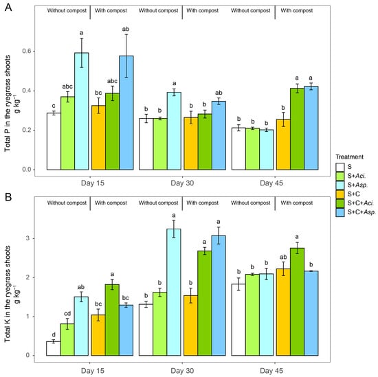 Concentrations of total P (A) and total K (B) in shoot tissues of ryegrass at three sampling time points (day 15, day 30, and day 45) across the six treatments. S: soil without fertilization, S + Aci.: soil inoculated with Acinetobacter sp., S + Asp.: soil inoculated with Aspergillus niger, S + C: soil mixed with straw compost, S + C + Aci.: soil mixed with straw compost and Acinetobacter sp., and S + C + Asp.: soil mixed with straw compost and Aspergillus niger. Data are shown as mean ± S.E. (n = 4). Different lowercase letters (a–d) indicate significant differences among different treatments at the same time point (Tukey’s HSD test at p < 0.05).