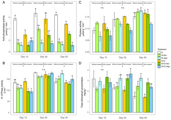 Activities of acid phosphatase (A), H+-ATPase (B) and phytase (C), as well as the concentrations of total chlorophyll (D) in shoot tissues of ryegrass at three sampling time points (day 15, day 30, and day 45) across the six treatments. S: soil without fertilization, S + Aci.: soil inoculated with Acinetobacter sp., S + Asp.: soil inoculated with Aspergillus niger, S + C: soil mixed with straw compost, S + C + Aci.: soil mixed with straw compost and Acinetobacter sp., and S + C + Asp.: soil mixed with straw compost and Aspergillus niger. Data are shown as mean ± S.E. (n = 4). Different lowercase letters (a–d) indicate significant differences among different treatments at the same time point (Tukey’s HSD test at p < 0.05).