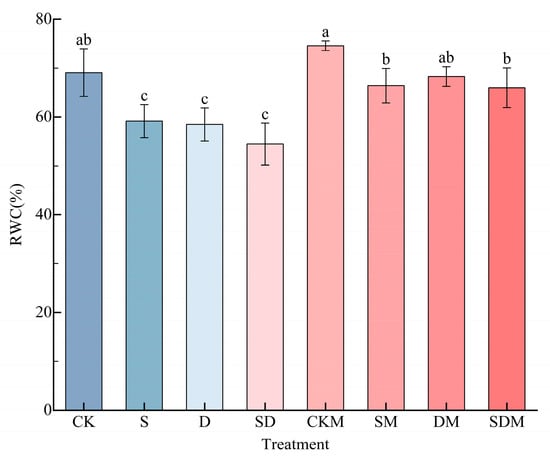 There was no significant difference in RWC between the CKM and CK treatments (p > 0.05). The RWC under the SM treatment increased by 12.26% compared with that under the S treatment, and the difference was significant (p < 0.05), and it recovered to 96.11% of that under CK treatment. Compared with the D treatment, the RWC under the DM treatment increased by 16.78% (p < 0.05), and it reached 98.83% of that under the CK treatment. The RWC of SDM treatment increased by 21.15% compared with that under the SD treatment, and the difference was significant (p < 0.05), which was 95.51% of that under the CK treatment. There was no significant difference in RWC among the plants that received the SM, DM, and SDM treatments, but the SDM treatment led to the highest increase in RWC, indicating that exogenous melatonin could significantly increase the RWC of C. esculentus blades under salt and drought stress, and it had the most significant effect during salt–drought stress.