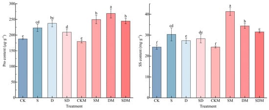Compared with the control, the Pro content increased by 18.78%, 26.45%, and 11.47%, and the SS content increased by 24.95%, 12.64%, and 16.63% under salt, drought, and salt–drought combined stress, respectively. The difference was significant (p < 0.05). Pro increased the most under the drought stress and least under the salt-drought stress; the amount of SS increased the most under salt stress and least under drought stress. This indicated that under salt stress the plant mainly resisted the stress by increasing the amount of Pro, and drought stress mainly resisted the stress by increasing the amount of SS, and the increase in the amount of SS in the C. esculentus blades was higher than the increase in the amount of Pro under salt–drought stress. The amounts of Pro and SS under the CKM treatment were not significantly different compared to those under the CK treatment (p > 0.05) (Figure 2). The amounts of Pro and SS increased to different degrees in all treatments after melatonin application, with the highest increase in Pro content being 16.96% under SDM treatment and the lowest increase being 11.88% under SM treatment, which was significant (p < 0.05); the highest increase in SS content was 36.21% under SM treatment and the lowest increase was 11.40% under SDM treatment, which was significantly different (p < 0.05). The greatest increase in Pro content was observed under the SDM treatment and the smallest increase in Pro content was observed under the SM treatment; the greatest increase in SS content was observed under the SM treatment and the smallest increase in SS content was observed under the SDM treatment. The results showed that melatonin had the most significant effect on Pro under salt–drought stress, and melatonin had the most significant effect on SS under salt stress.
