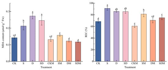 Compared with the CK treatment, the MDA content and REC under salt, drought, and salt–drought stress increased to a certain extent (Figure 3). Compared with the CK treatment, the MDA content and REC under S treatment significantly increased by 49.25% and 32.80%, respectively (p < 0.05). The MDA content and REC of the C. esculentus blades under the D treatment significantly increased by 91.35% and 25.08%, respectively (p < 0.05). The MDA content and REC of the blades under SD treatment significantly increased by 72.84% and 24.62%, respectively (p < 0.05). There was no significant difference in MDA content between the plants subjected to the D and SD treatmetns, and the MDA content following the S treatment was significantly lower than that following treatment with D and SD; there was no significant difference in REC between the S, D, and SD treatments, but S led to the highest increase. The REC and MDA content were not significantly different following the CKM treatment compared to the CK treatment (p > 0.05). Comparing the stresses, the MDA content and REC were most reduced following the DM treatment, by 55.02% and 17.71%, respectively (p < 0.05); and were least reduced following the SM treatment, by 26.05% and 10.97%, respectively (p < 0.05). It has been shown that the exogenous application of melatonin was able to significantly (p < 0.05) reduce the MDA content and the REC of blades of C. esculentus under stress conditions, and had the strongest regulatory effect on C. esculentus’ MDA and RWC under drought stress.