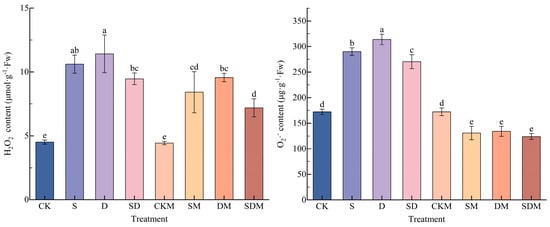 The H2O2 and O2·− contents in the blade of C. esculentus were increased to a certain extent under salt, drought, and salt–drought combined stress (Figure 4). Compared with the CK treatment, the H2O2 and O2·− contents significantly increased by 135.38% and 68.40%, respectively, under the S treatment, by 153.22% and 82.14%, respectively, under the D treatment, and by 109.92% and 56.91%, respectively, under the SD treatment (p < 0.05). Both H2O2 and O2·− were significantly higher following the D treatment than the S and SD treatments, and there was no significant difference between H2O2 and S, and O2·− was significantly lower than S following the SD treatment, indicating that the highest accumulation of ROS was observed in C. esculentus under drought stress, whereas the addition of salt stress to drought stress reduced the accumulation of ROS. The difference in H2O2 content and O2·− content under CKM treatment was not significant (p > 0.05) compared to that under the CK treatment. Compared to no melatonin application, both the H2O2 and O2·− contents were reduced the most under SDM treatment, by 24.02% and 58.14%, and the difference was significant (p < 0.05), while the H2O2 content was reduced the least under DM treatment, by 16.25% (p < 0.05), and the O2·− content was reduced the least under SM treatment, 54.94% (p < 0.05). It has been shown that 150 µmol·L−1 of melatonin reduced the accumulation of ROS in C. esculentus under salt, drought, and salt–drought stress, and H2O2 and O2·− responded most strongly to melatonin under salt-drought stress.