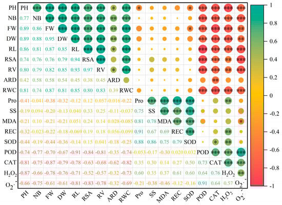 To explore the relationship between the growth of C. esculentus seedlings and the physiological and metabolic indexes of C. esculentus and to evaluate the resistance of C. esculentus seedlings to salt and drought stress under MT treatment, a Pearson correlation analysis was carried out among various traits (Figure 6). The correlation between the morphological indexes of C. esculentus reached a significant level (p < 0.05). The correlation between each morphological index and the RWC reached a significant level (p < 0.001), and the correlation between POD, CAT, and H2O2 reached a significant level (p < 0.001). The correlation with O2·− reached a significant level (p < 0.01). Between the indicators, a certain correlation was observed in the relevant data matrix; thus, the growth effects overlapped. Therefore, the evaluation of the sustained release effect of MT should be combined with multiple indicators for reliability.