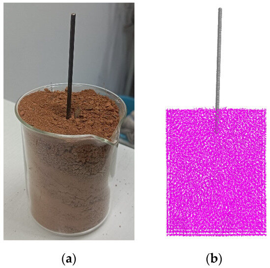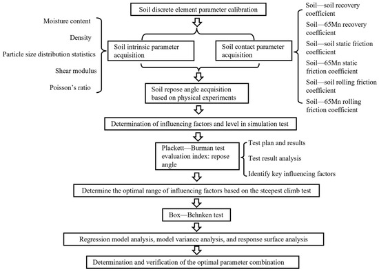 Establishing a discrete element model of soil and calibrating contact parameters can enhance the accuracy of numerical simulations in soil and tool preparation. It also provides a foundation and basic parameters for studying soil–tool interaction mechanisms [11,12,13]. Before conducting a DEM simulation analysis, it is crucial to accurately construct the discrete element model of the soil. Yang et al. [14] used the repose angle as a response, calibrated red clay in hilly areas based on physical experiments and simulation tests, and obtained the contact parameters. Du et al. [15] used the Hertz–Mindlin and JKR contact models in EDEM to calibrate the contact parameters involved in the interaction between tilled loose soil and Q235 steel in response to the angle of repose and obtained their optimal parameter combination. The calibration results were verified through field experiments. Zhong et al. [16] used the same method to obtain the discrete element model parameters of soil in rice fields.