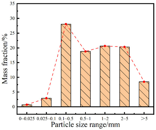 After sieving, the masses corresponding to different particle sizes were measured using an electronic scale. The mass fractions corresponding to the particle sizes of the soil can be found in Table 1 and Figure 3. The mass fractions of the soil particles in different size ranges were as follows: 0.75% (0~0.025 mm), 2.91% (0.025~0.1 mm), 28.06% (0.1~0.5 mm), 18.81% (0.5~1 mm), 20.62% (1~2 mm), 20.34% (2~5 mm), and 8.50% (>5 mm).