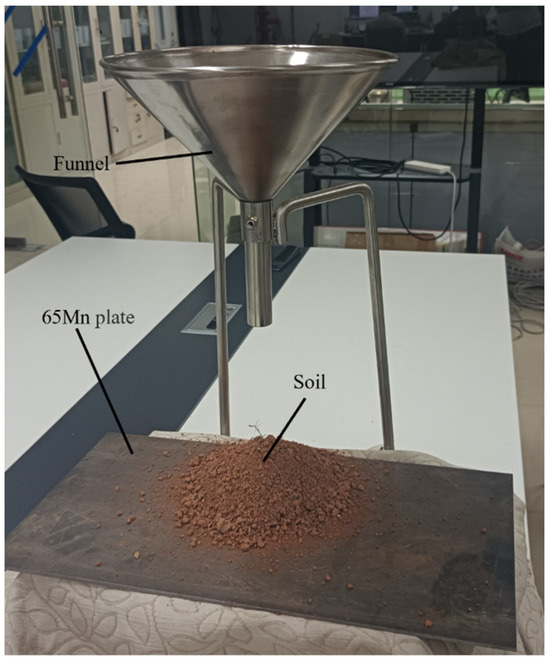 The repose angle refers to the angle at which a significant amount of material collects on a horizontal surface to form a stable cone-shaped pile. To measure the soil repose angle, we employed the funnel method and constructed a test platform, depicted in Figure 6 [25,26].