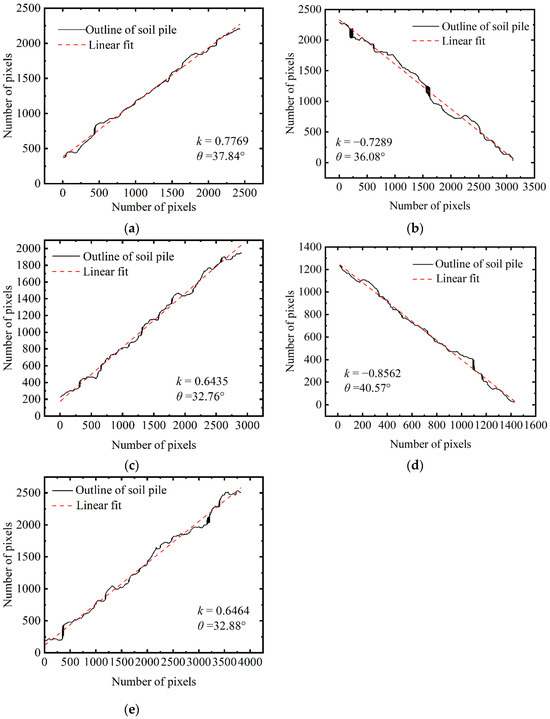 - The boundary contour line was linearly fitted using the least squares method to obtain the fitting straight line and equation. The slope (k) of the equation was obtained. The repose angle was calculated using Formula (3).