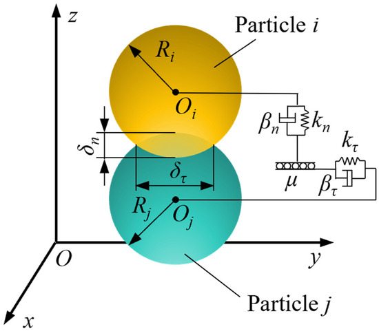 Schematic diagram of the contact model. Note: Oi and Oj are the spherical center positions of the two particles, respectively; Ri and Rj are the radii of the two particles, respectively; δn is the normal overlap amount when the particles collide (m); kn and kτ are the normal and tangential Huco coefficients of the particles, respectively; βn and βτ are the normal and tangential damping coefficients of the particles, respectively; and μ is the static friction coefficient between the particles.