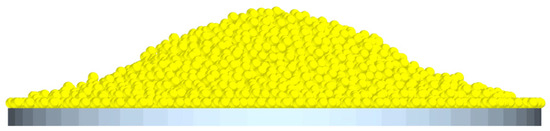 This study utilized EDEM software for the simulation. The computer had a 13th Gen Intel(R) Core (TM) i5-13490F CPU, 32 GB RAM, and an NVIDIA GeForce RTX 3050 graphics card with 8 GB video memory. The soil model parameters play a crucial role in the simulation results; thus, accurately setting these parameters is of utmost importance. Material parameters, such as the density, Poisson’s ratio, and shear modulus, were determined through the experiments or literature and are listed in Table 3. The contact parameters, including the static friction factor, rolling friction factor, and collision recovery coefficient, were determined based on the data from the measurement tests and relevant references [28,30,31,32]. The recommended ranges for these contact parameters are provided in Table 4. The particle generation method was set to dynamic, with a generation rate of 2000 particles/s and a total of 24,000 generations. The simulation time was set to 18 s, with a time step of 0.2 s and a grid size of 10R. The gravity acceleration was set to 9.81 m/s2, and the time step was set to 19% of the Rayleigh time step. The particle size distribution was determined according to Table 3. After 18.0 s, a stable particle pile was formed (Figure 11).