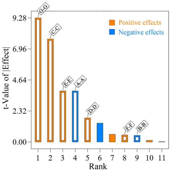 The Plackett–Burman screening test design and results are presented in Table 5, with the analysis based on the test results displayed in Table 6 and Figure 12. The order of significance, from largest to smallest, was as follows: surface energy of soil for the JKR model, soil–soil rolling friction coefficient, soil–65 Mn static friction coefficient, and soil–soil recovery coefficient. Consequently, these four influencing factors were chosen for further steepest climbing tests.