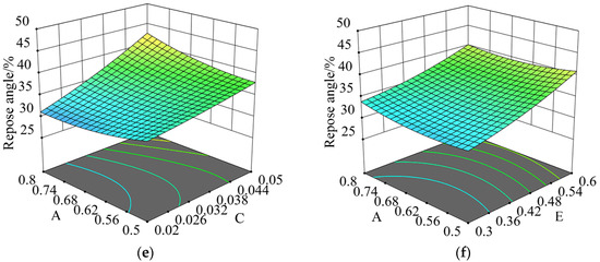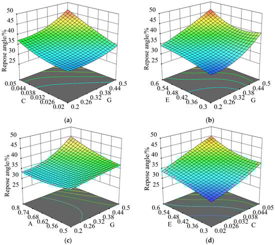 Figure 13 illustrates that the influence of G, C, E, and A on the repose angle aligns with the findings of the Plackett–Burman test mentioned earlier. Notably, the response surface curve for G exhibited the sharpest incline, suggesting it had the most pronounced effect on the repose angle. Conversely, the curve for A showed a more gradual slope, indicating that its effect on the repose angle was the least significant. Furthermore, G, C, and E had a positive effect on the repose angle, whereas A had a negative effect.