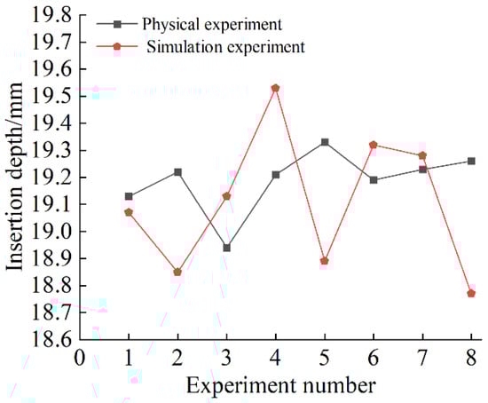 The reliability of the calibration parameters was further confirmed using the 65 Mn steel rod insertion method based on the optimal parameter combination identified previously (Figure 15). The dimensions of the container in which the soil was placed (base area and height) corresponded to the dimensions of the glass container. In both the physical and simulation tests, a 3 mm wide and 100 mm long steel rod was dropped freely from a height of 150 mm onto the soil, and the depth of the steel needle inserted into the soil after the fall was measured. The physical test and simulation test were repeated eight times each, and the statistical results are presented in Figure 16. The final result was determined by taking the average value from both the physical and simulation tests. The physical test yielded an average insertion depth of 19.31 mm, while the simulation test yielded an average insertion depth of 18.98 mm, resulting in a relative error of 1.71%. This test once again verified the reliability of the calibrated parameters.
