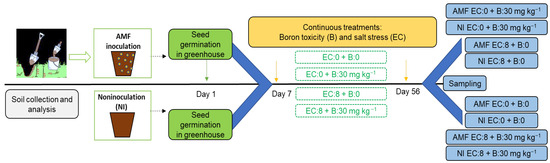 Maize (Zea mays L.) stands as a cornerstone crop globally and is crucial for ensuring food security for both humans and animals. However, it faces potential threats from boron toxicity and salinity stress, which can adversely impact its growth and yield, thereby jeopardizing food production systems [10]. The predominant visible symptom observed in maize plants subjected to excessive boron exposure is the development of burns, characterized by chlorotic and/or necrotic patches that appear primarily on the margins and tips of mature leaves [10,11]. Research on the effects of arbuscular mycorrhizal fungi (AMF) on maize plants subjected to both boron toxicity and saline conditions is scarce. The global enhancement of maize productivity hinges largely on effectively managing existing saline soils and preventing the encroachment of salts and soils high in B content [12]. Given that boron toxicity frequently co-occurs with salt stress, the goals of the current work were to investigate whether AMF are able to alleviate B toxicity in maize plants under salt stress. Thus, the key goal of this study was to develop environmentally friendly models, such as plant inoculation with AMF, that may help to prevent the damages caused by B toxicity and salinity stress in maize plants in calcareous soil.