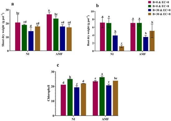Shoot dry weight (a), root dry weight (b), and chlorophyll content (c) of AMF-inoculated maize plants grown under combined boron (30 mg kg−1 B) and salinity stress (8 dS m−1). NI: noninoculation; AMF: C. etunicatum; EC, electrical conductivity (dS m−1). Bars with the same letter are not significantly different at p < 0.05 according to Duncan’s multiple range test.