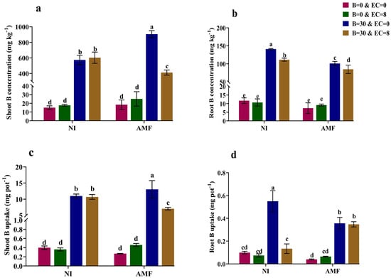 Shoot B concentration (a), root B concentration (b), shoot B uptake (c), and root B uptake (d) of AMF-inoculated maize plants grown under combined boron (30 mg kg−1 B) and salinity stress (8 dS m−1). NI: noninoculation; AMF: C. etunicatum; EC, electrical conductivity (dS m−1). Bars with the same letter are not significantly different at p < 0.05 according to Duncan’s multiple range test.
