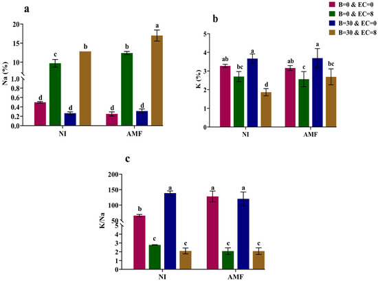 Na concentration (a), K concentration (b), and K/Na ratio (c) in shoots of AMF-inoculated and noninoculated maize plants under combined boron (B) and salinity stress. NI, noninoculation; AMF, C. etunicatum; EC, electrical conductivity (dS m−1). Bars with the same letter are not significantly different at p < 0.05 according to Duncan’s multiple range test.