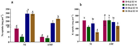 Shoot sodium (Na) uptake (a) and shoot potassium (K) uptake (b) in mycorrhizal and nonmycorrhizal inoculations under combined boron (B) and salinity stress. NI, noninoculation; AMF, C. etunicatum; EC, electrical conductivity (dS m−1). Bars with the same letter are not significantly different at p < 0.05 according to Duncan’s multiple range test.