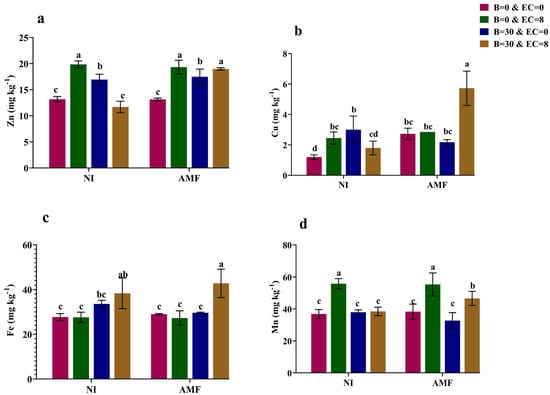 Shoot zinc (Zn) concentration (a), shoot copper (Cu) concentration (b), shoot iron (Fe) concentration (c), and shoot manganese (Mn) concentration (d) under mycorrhizal and nonmycorrhizal inoculation under combined boron (B) and salinity stress. NI, noninoculation; AMF, C. etunicatum; EC, electrical conductivity (dS m−1). Bars with the same letter are not significantly different at p < 0.05 according to Duncan’s multiple range test.