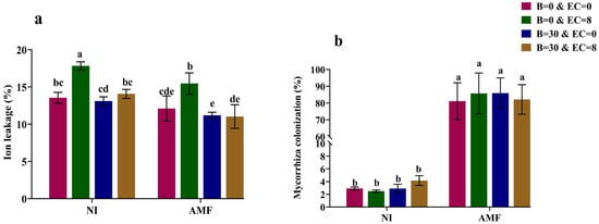 Ion leakage (a) and root colonization (b) under mycorrhizal and nonmycorrhizal inoculation under combined boron (B) and salinity stress. NI, noninoculation; AMF, C. etunicatum; EC, electrical conductivity (dS m−1). Bars with the same letter are not significantly different at p < 0.05 according to Duncan’s multiple range test.