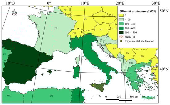 Experimental site location in the Mediterranean area and on the island of Sicily, Italy. Mean olive oil production calculated using FAOSTAT (2022) [3] data from 2018 to 2022.