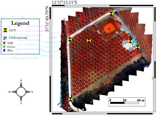 The surveys were planned by setting the same flight parameters. Specifically, flights were performed at an altitude of 70 m a.g.l., achieving a Ground Surface Distance (GSD) of 3.6 cm/pixel. Lateral and frontal overlaps between frames were 70%, while the gimbal tilt was set to acquire nadiral images. Before each flight, seven Ground Control Points (GCPs) and the reflectance calibration panel were placed to perform geometric and radiometric calibration, respectively. The GCPs were placed uniformly at the edges and centre of the plot on a solid platform (Figure 3) and georeferenced using a GNSS instrument, specifically the Stonex S7-G (Milan, Italy) with an external antenna and RTK correction, as described in previous studies [31].