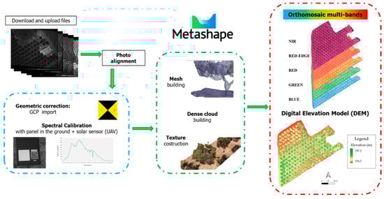 The multispectral and RGB images, once acquired, were processed to obtain a multi-band orthomosaic and a Digital Elevation Model (DEM). These products were obtained through a photogrammetric process performed using the Agisoft Metashape Professional software (version 1.7.3), as shown in the workflow below (Figure 4). The individual steps of the photogrammetric process are described in Catania et al. (2023) [12].