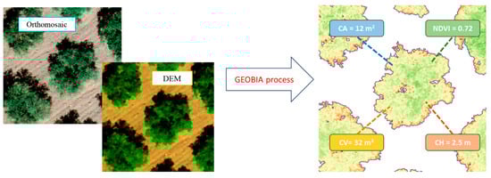 The orthomosaic, DEM and Digital Terrain Model (DTM) were processed by applying different Object-Based Image Analysis (OBIA) methodologies in order to obtain the single canopy of each plant and its vegetative and spectral information. The DTM was obtained through a geostatistical interpolation process of soil points. OBIA was performed using the open-source software QGIS ver. 3.16.6 Hannover [32] and the Saga and Grass tools implemented within. Image classification and segmentation was obtained [33] using the VI map [11] and Crop Surface Model (CSM) [12]. NDVI was the vegetation index used to determine the spectral variability and carry out the classification process, while CSM was used to obtain the geometric information. The CSM was determined from the DEM and DTM, as described in Catania et al. (2023) [12].