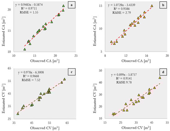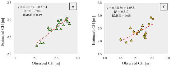 In this experiment, the geometric conditions were expressed as CH, CA and CV. The spatial variability of these characteristics was obtained by processing high-resolution UAV images with high precision. In particular, the best results were obtained for CA estimation (Figure 8), showing low RMSE and high coefficients of determination, as also observed in other studies [35,36]. Also, CV showed a very good correlation between the predicted values (estimated by UAV) and those observed in the field (Figure 8c,d).