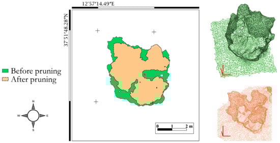 Geometric variation of the canopy plant of a sample tree due to pruning in 3D and 2D view.