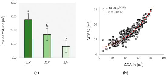 (a) Biomass removed with pruning in the three vigour levels. (b) Correlation between volume and canopy area variation. The different bars colours represent the three vigour levels of the plants. Letters ‘a’, ‘b’, and ‘c’ indicate statistically significant differences among the groups, while red line is the line interpolating the data.