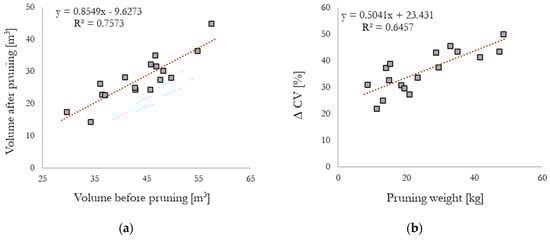 (a) Correlation between volume before and after pruning in the 17 selected plants. (b) Correlation between ΔCV and pruning weight (kg). The red line is the line interpolating the data.