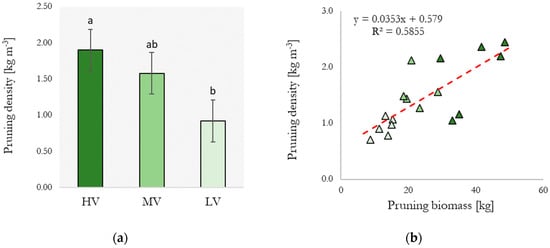(a) Biomass pruning density removed in the three vigour levels. (b) Correlation between pruning biomass and pruning density in the 17 selected plants. The different colours of the triangles and bars represent the three vigour levels of the plants. Letters ‘a’, ‘b’, and ‘c’ indicate statistically significant differences among the groups, while the red line is the line interpolating the data.