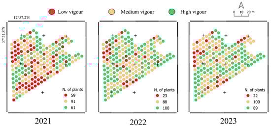 Distribution of all plants in the three levels of vigour over the three-year experimental period, evaluated at the BBCH74 phenological stage.